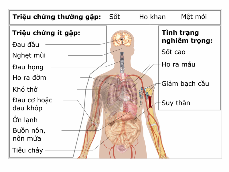 Các triệu chứng của bệnh nhân mắc Covid-19 từ nhẹ đến nặng bao gồm: sốt, ho và khó thở. Các triệu chứng này có thể xuất hiện từ 02 đến 14 ngày sau khi tiếp xúc nguồn bệnh. Tới khi khởi phát, Covid-19 gây sốt và có thể tổn thương đường hô hấp. Trường hợp nặng, gây viêm phổi và có thể nhiều cơ quan khác trong cơ thể khiến bệnh nhân tử vong, nhất là các trường hợp có bệnh nền.